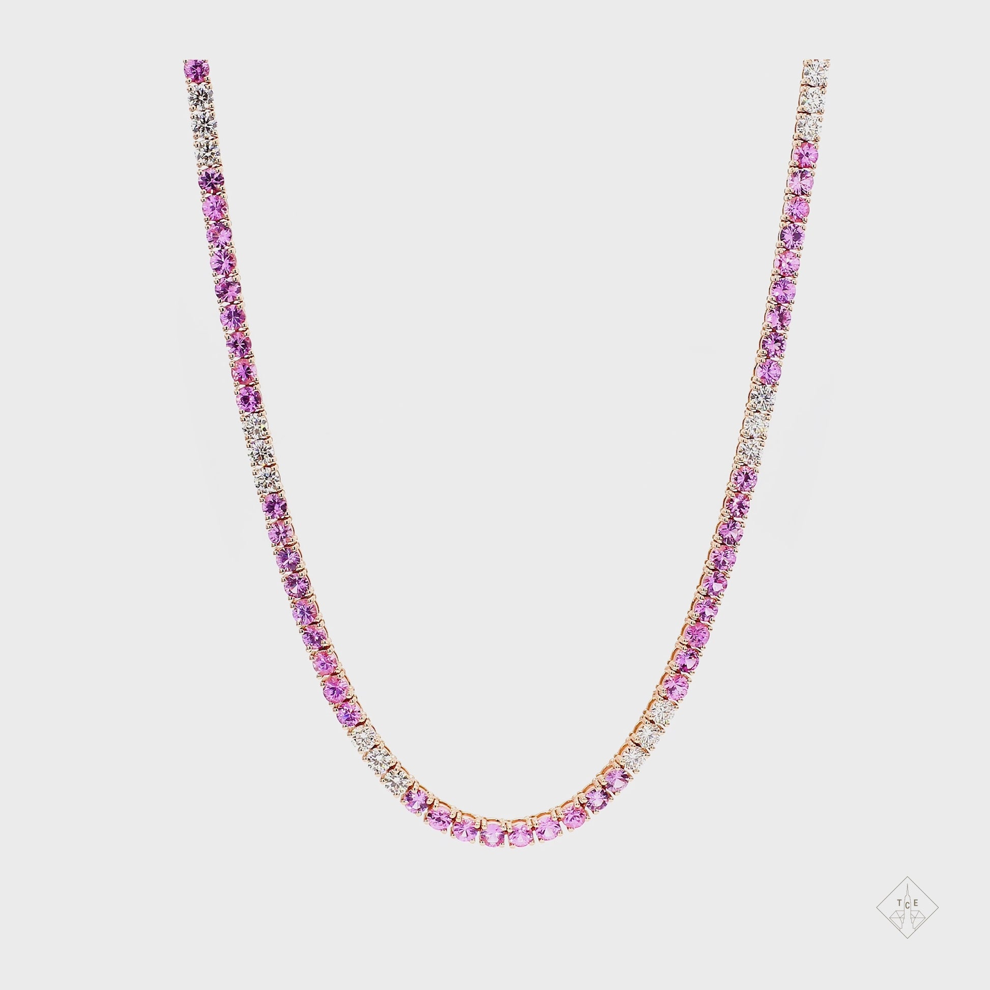 18K Rose Gold Diamond & Pink Sapphire Tennis Necklace Tw. 14.96 carat