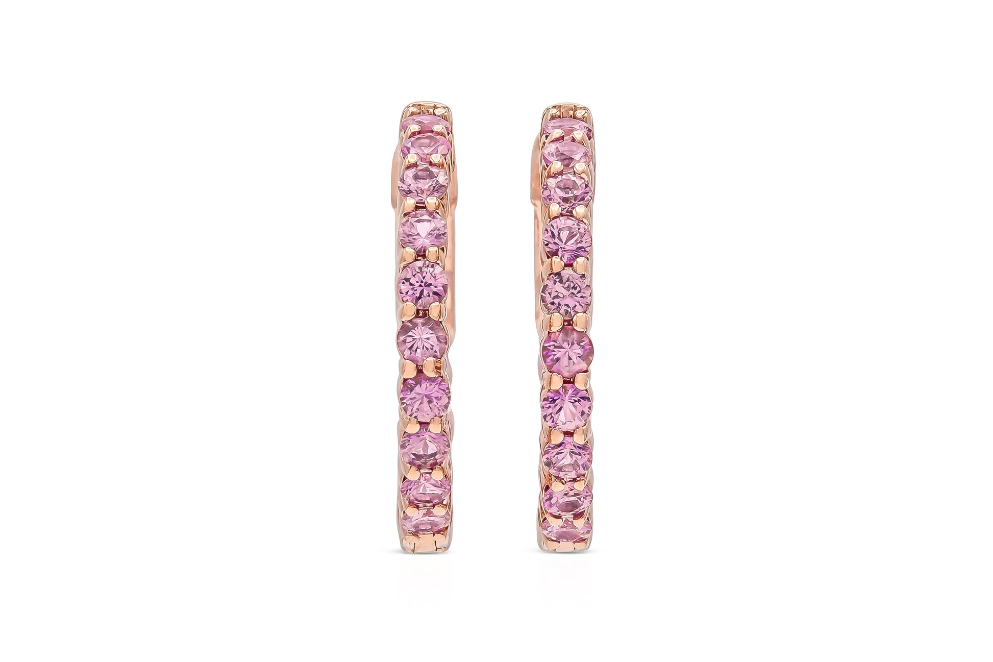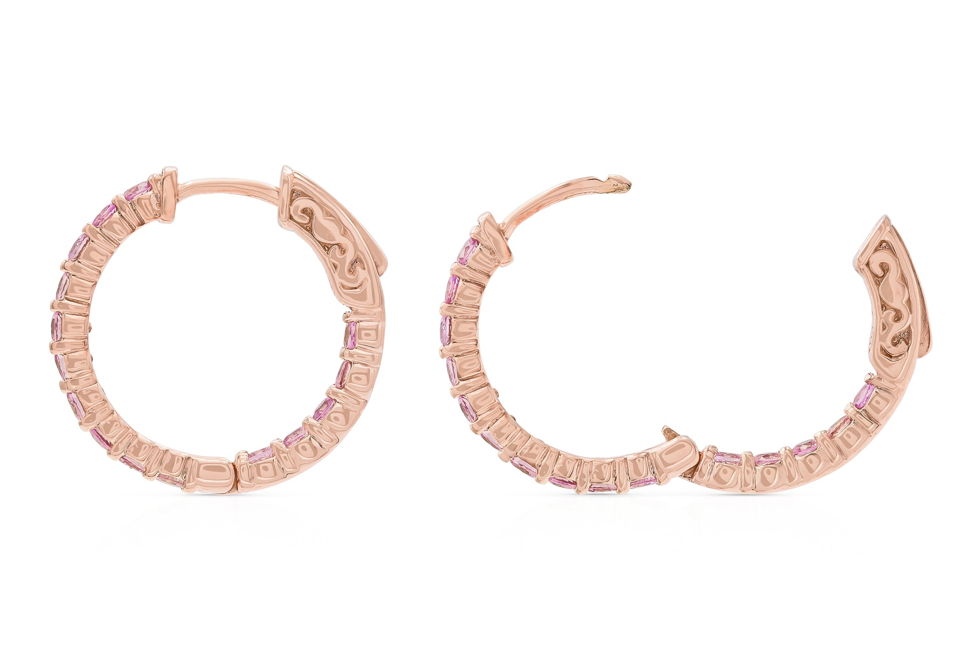Handmade 18K Rose Gold Hoops with 30 Natural Round Brilliant Cut Pink Sapphires weighting appx. 2.15 carat.