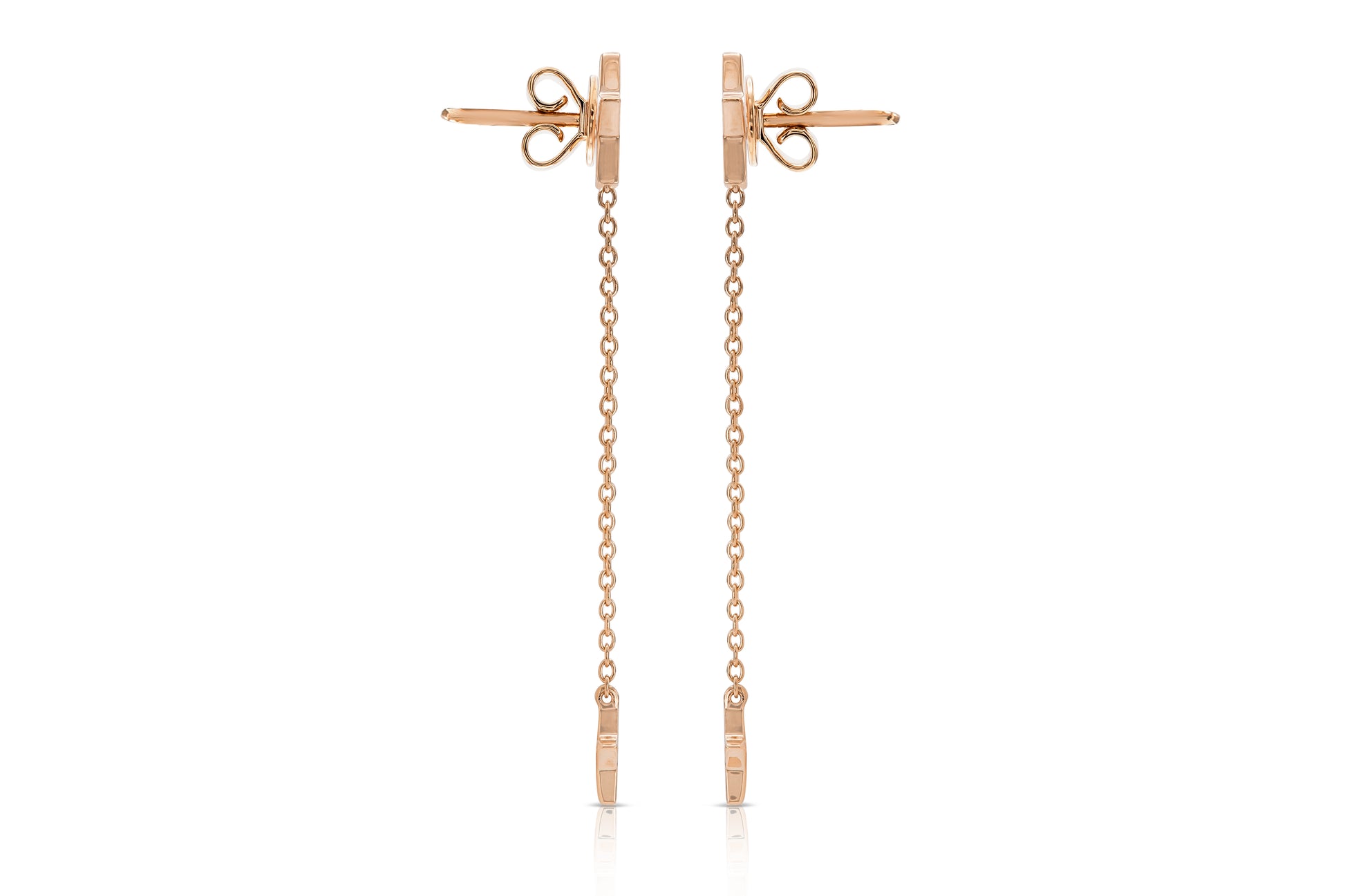 Handmade 18k Rose Gold Diamond Drop Earrings with 24 Round Brilliant Cut Diamonds F color VS1 weighting approximately 0.29 carats, 2.25 inch length.