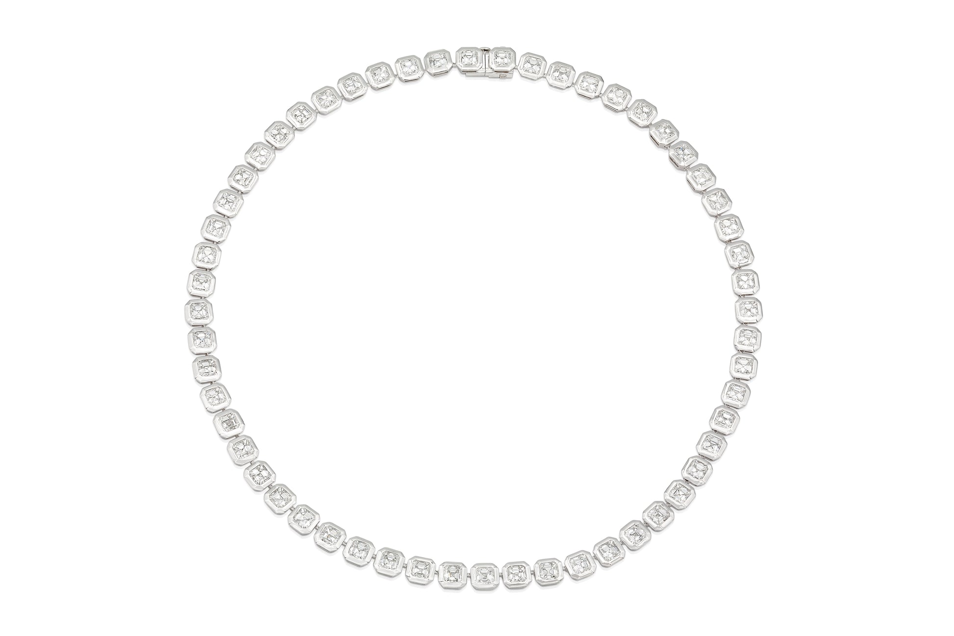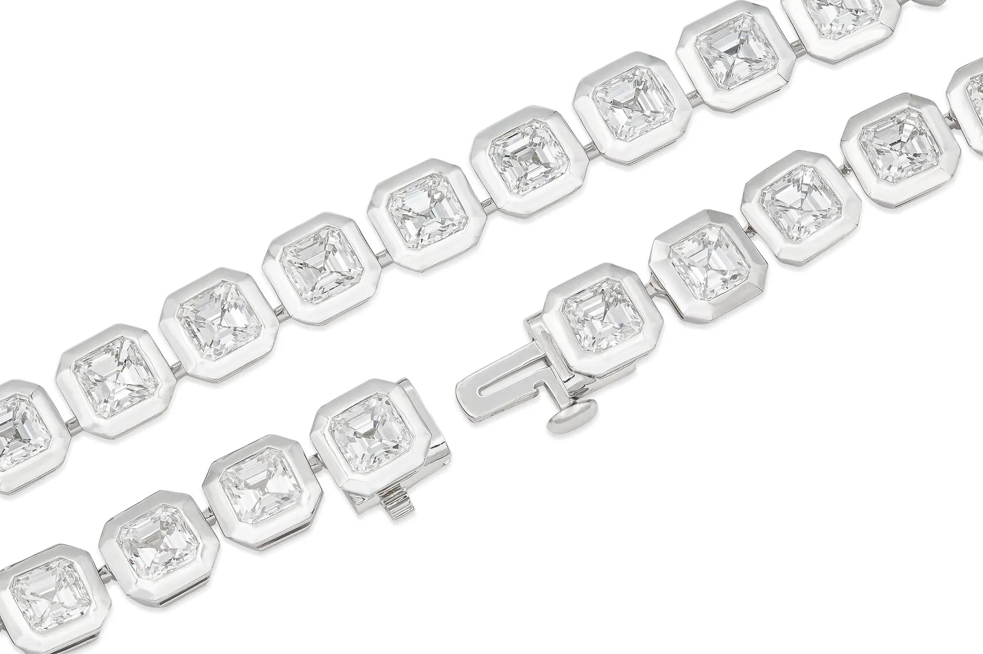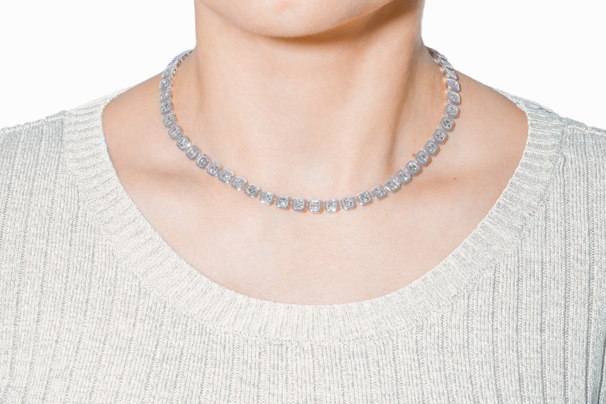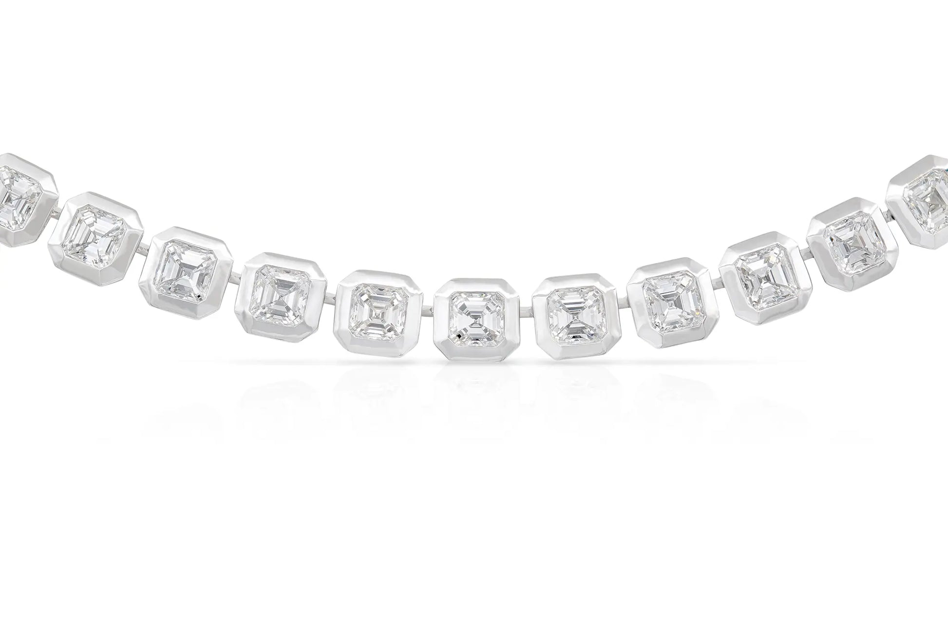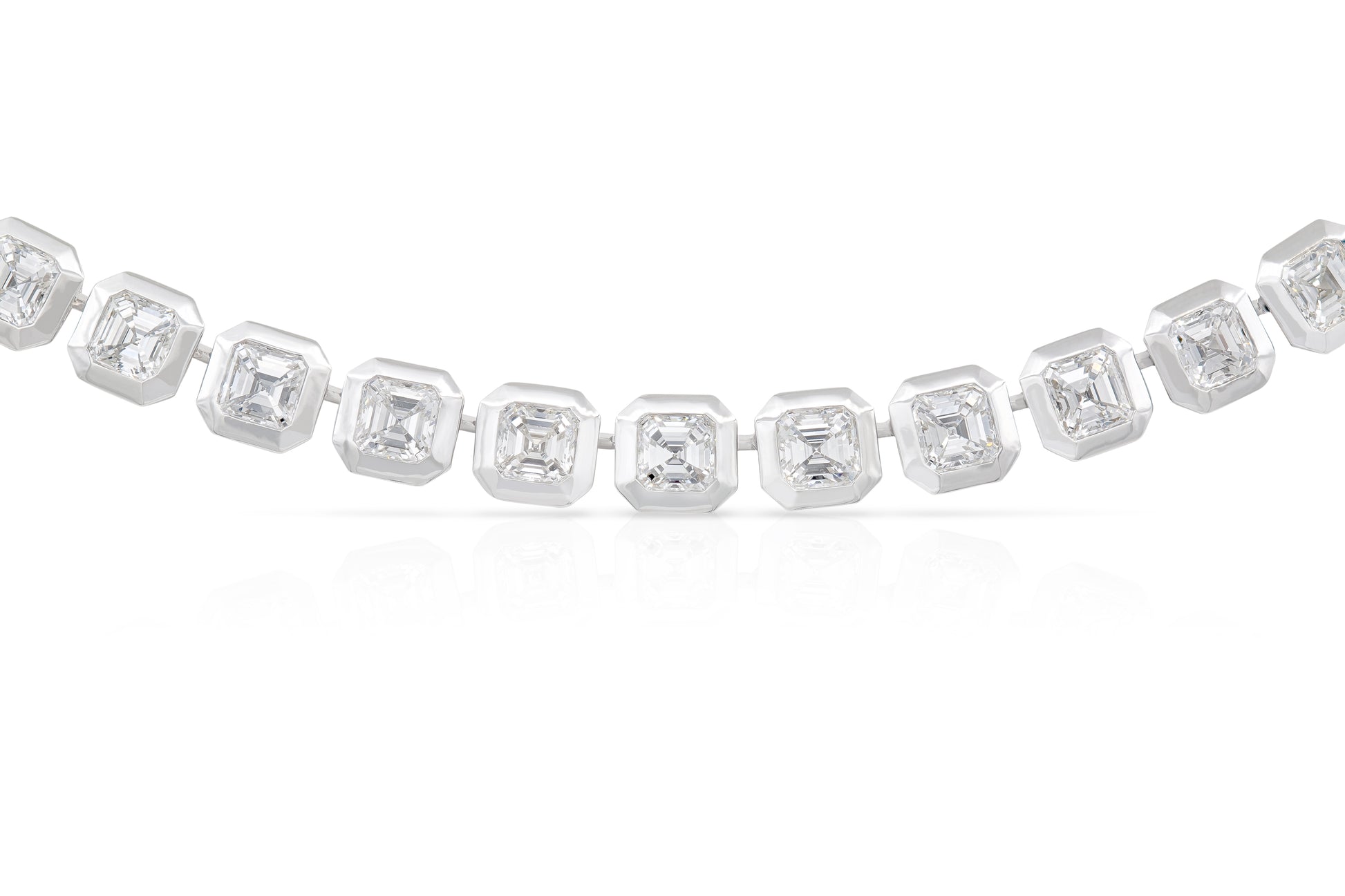 Handmade One-of-a-kind 18K White Gold Bezel Set Necklace with 56 GIA certified Natural Asscher Cut Diamonds D-E-F color VVS1-VS1 clarity weighting in total 22.70 carat, 16 inch.