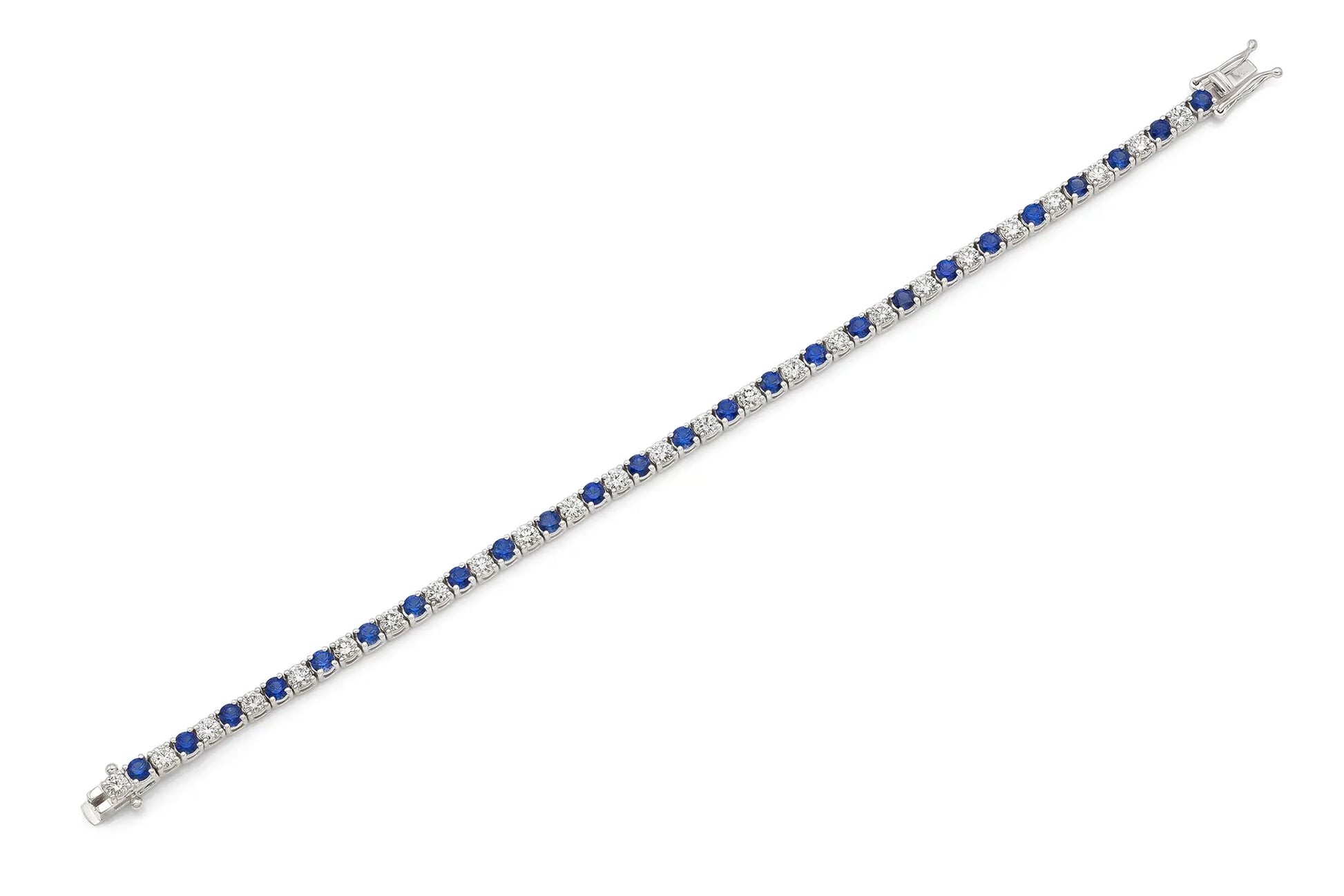 Handmade 18K White Gold Tennis Bracelet with 25 Round Brilliant Cut Diamonds D color VVS1 clarity and 25 Round Brilliant Cut Natural Blue Sapphires, weighting in total 5.54 carats, size 6.5inch.