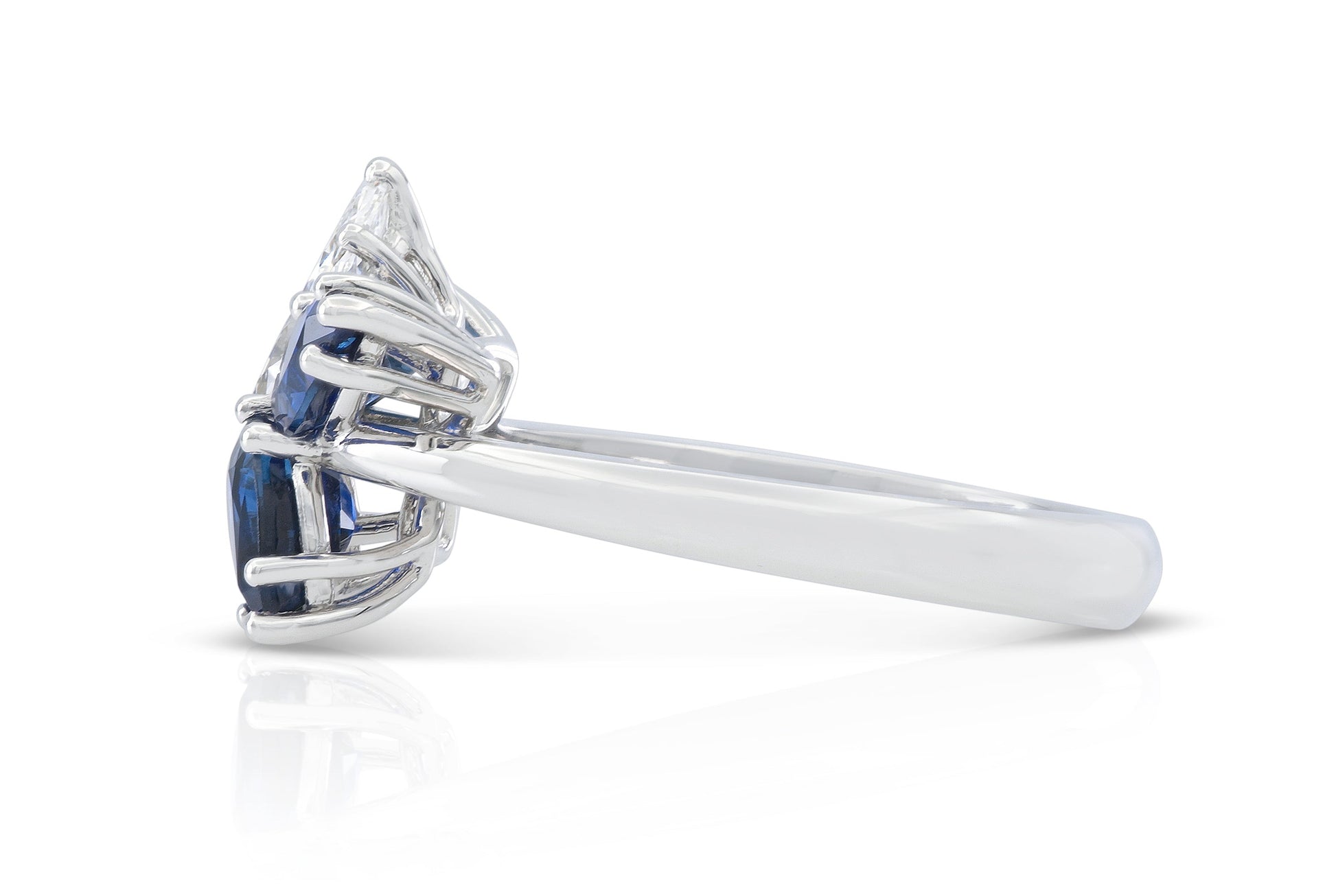 Handmade Platinum Castellation Ring with 2 GIA certified Pear Shape Diamonds D color VS1-VS2 clarity weighting 0.80 carat & 3 Natural Royal Blue Sapphire weighting 1.68 carat, Tw. 2.48 carat, 6.67g