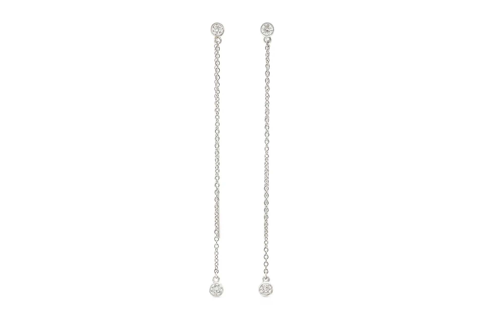 Handmade 18K White Gold Thread Earrings with 4 Round Brilliant Cut Diamonds D color VVS1 clarity weighting approximately 0.25 carats, 2.25 inch length.