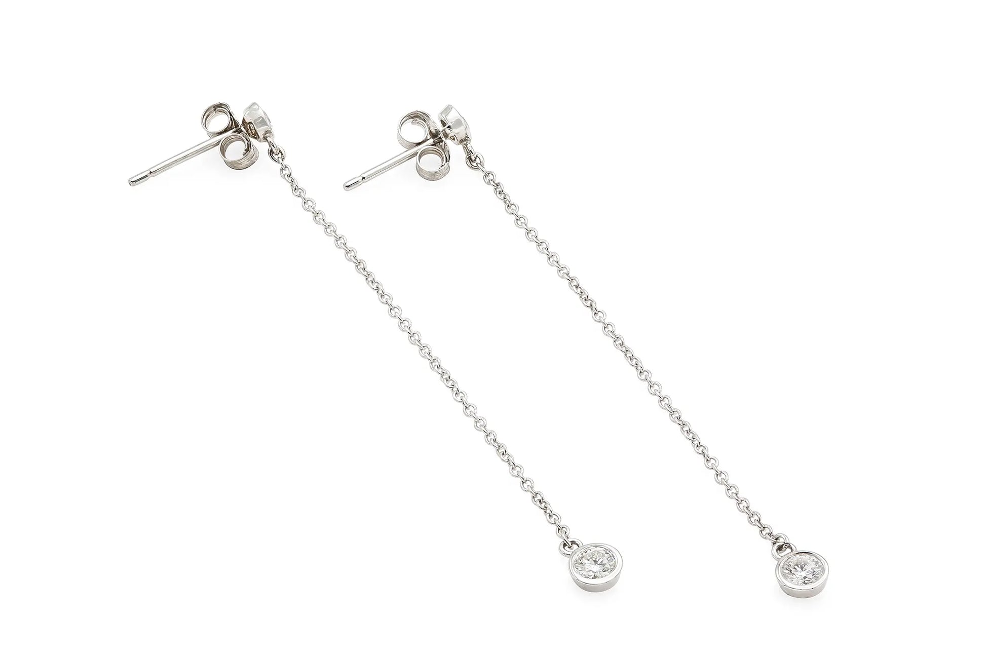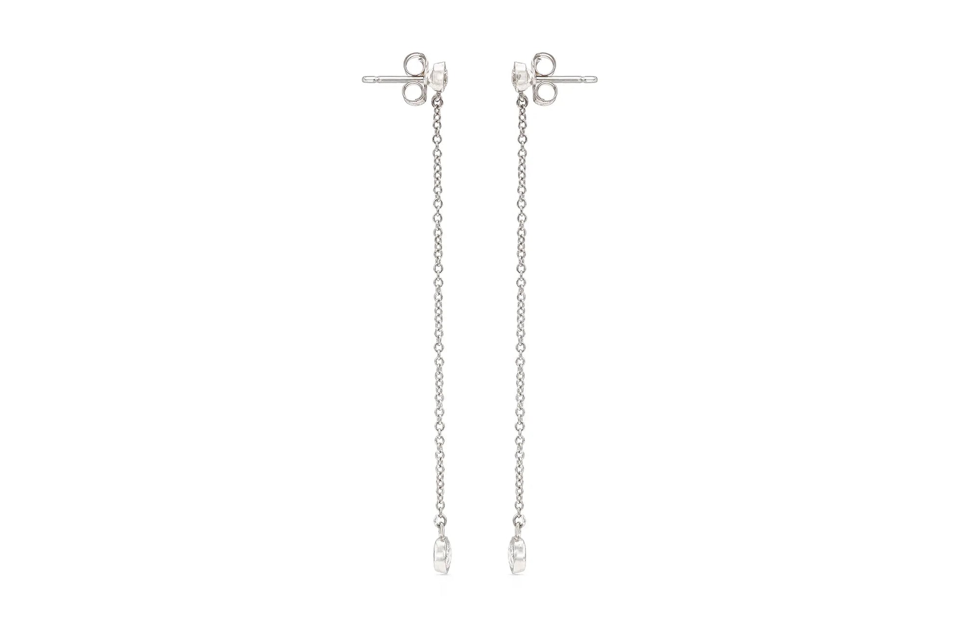 Handmade 18K White Gold Diamond Thread Earrings with 4 Round Brilliant Cut Diamonds D color VVS1 clarity weighting 0.25 carats, 2.25 length.