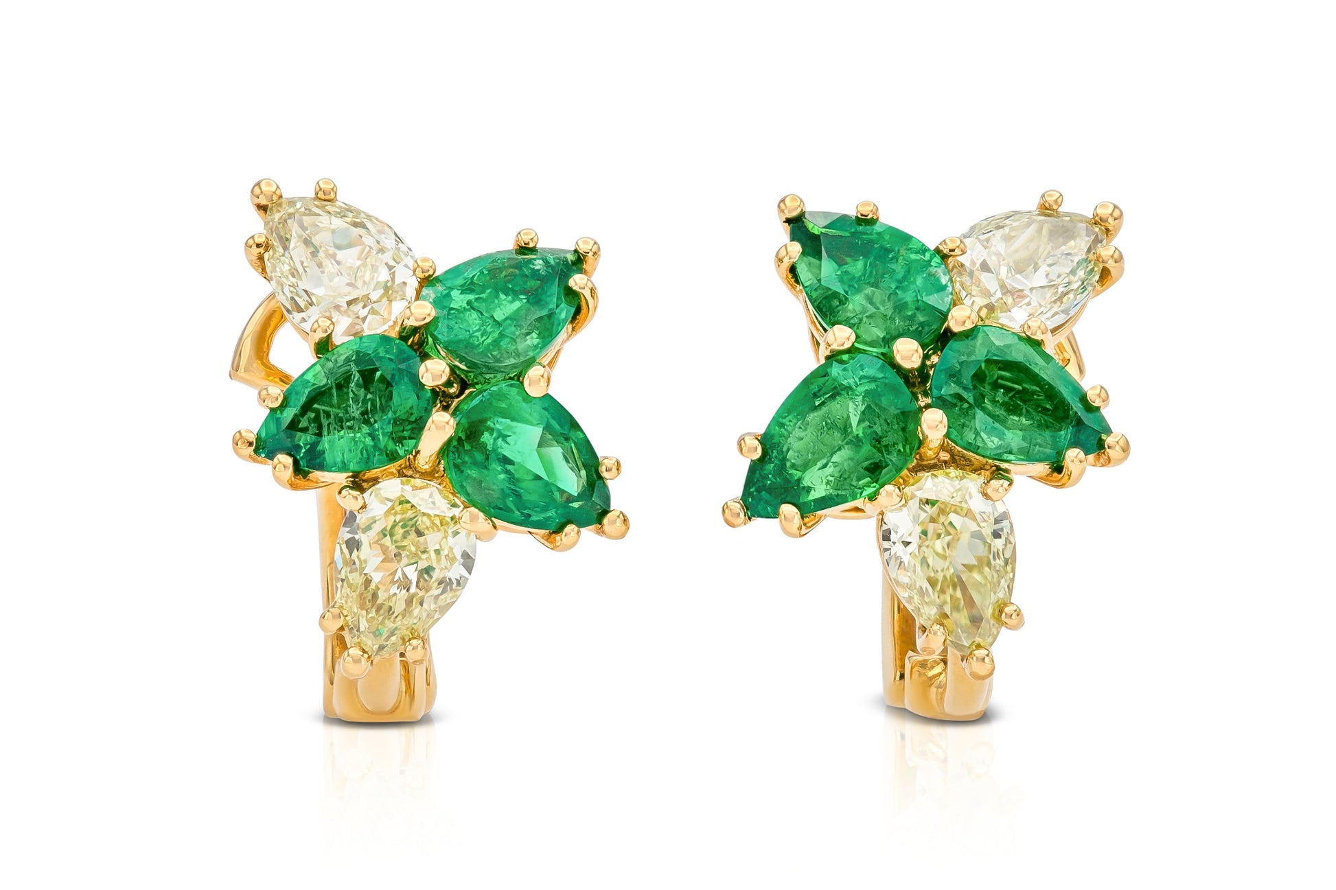 Handmade 18K Yellow Gold Constellation Earrings with 4 Pear Shape Fancy Yellow Diamonds weighting 1.60 carats and 6 Pear Shape Natural Colombian Green Emeralds weighting 1.80 carats.