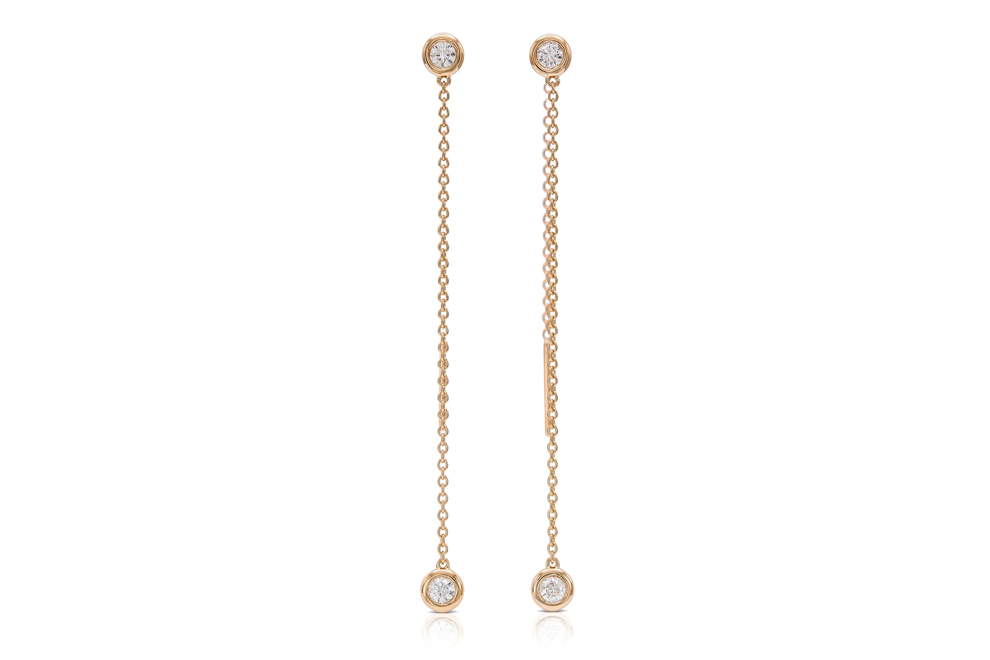 Handmade 18K Yellow Gold Thread Earrings with 4 Round Brilliant Cut Diamonds D color VVS1 clarity weighting approximately 0.25 carats, 2.25 inch length.