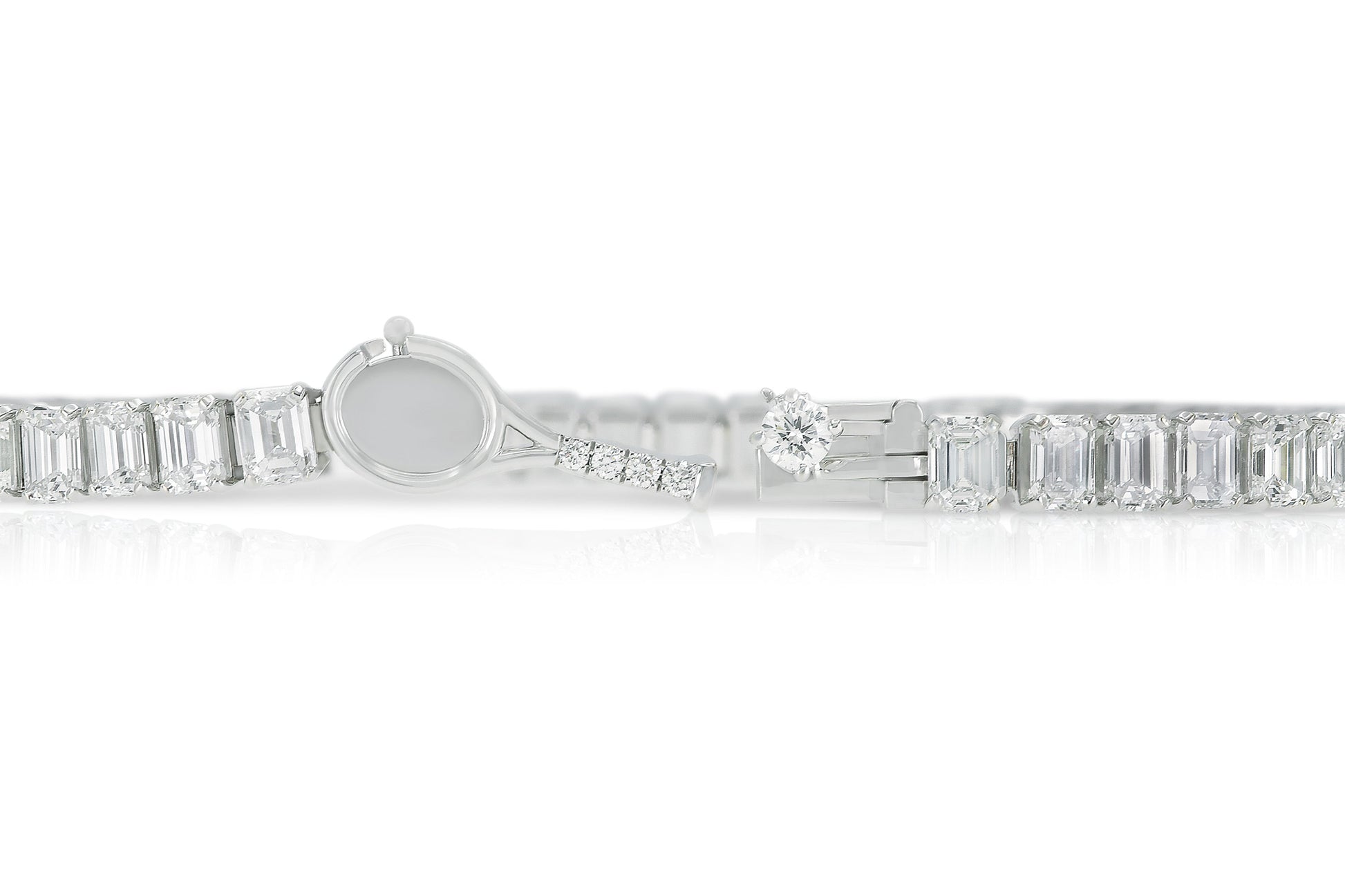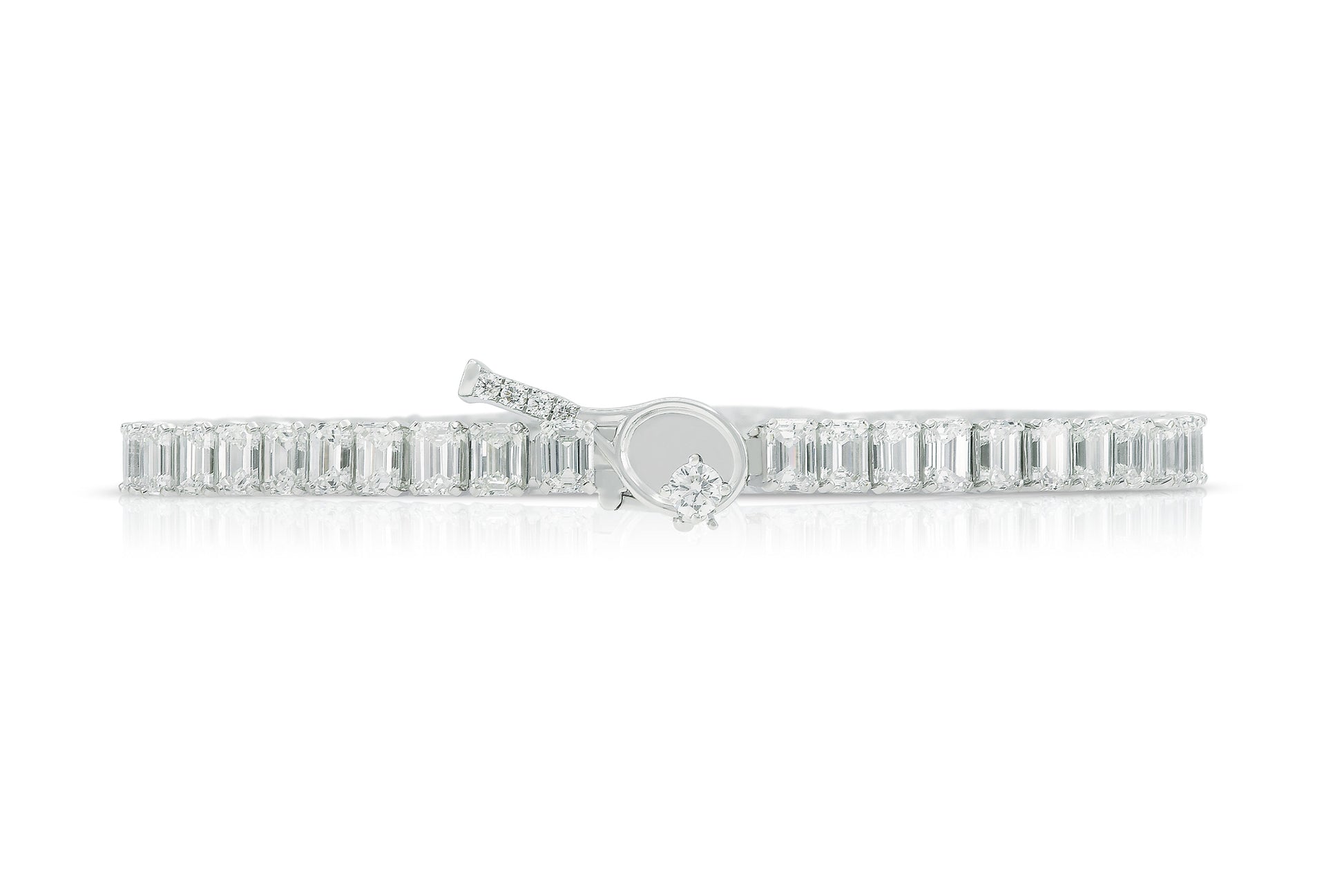 Handmade 18K White Gold Tennis Bracelet with 51 Emerald Cut Diamonds D color VVS clarity weighting 9.45 carat, tennis racquet lock with 5 RB D VVS Tw. 0.18 carat, 6.5 inch.