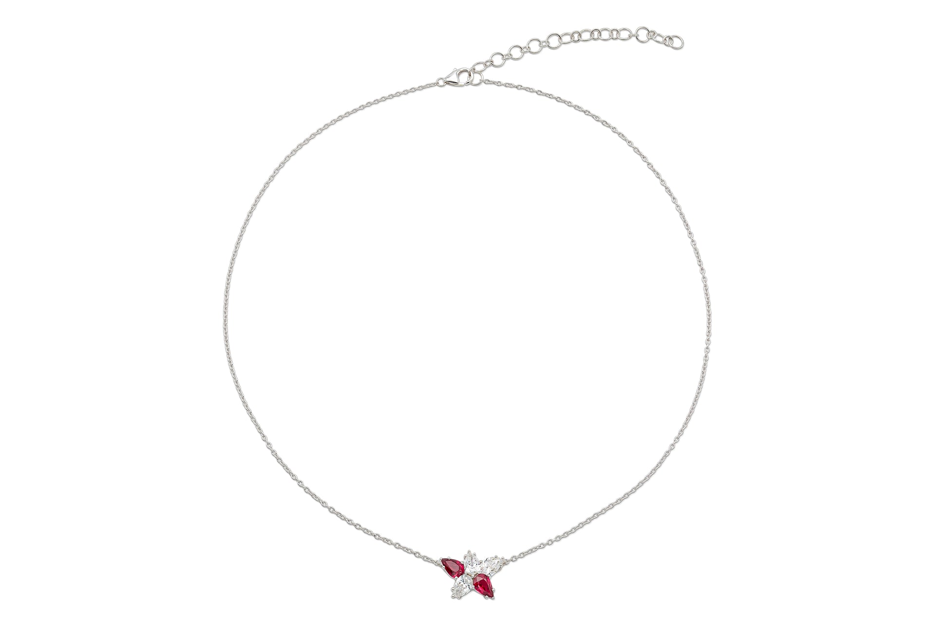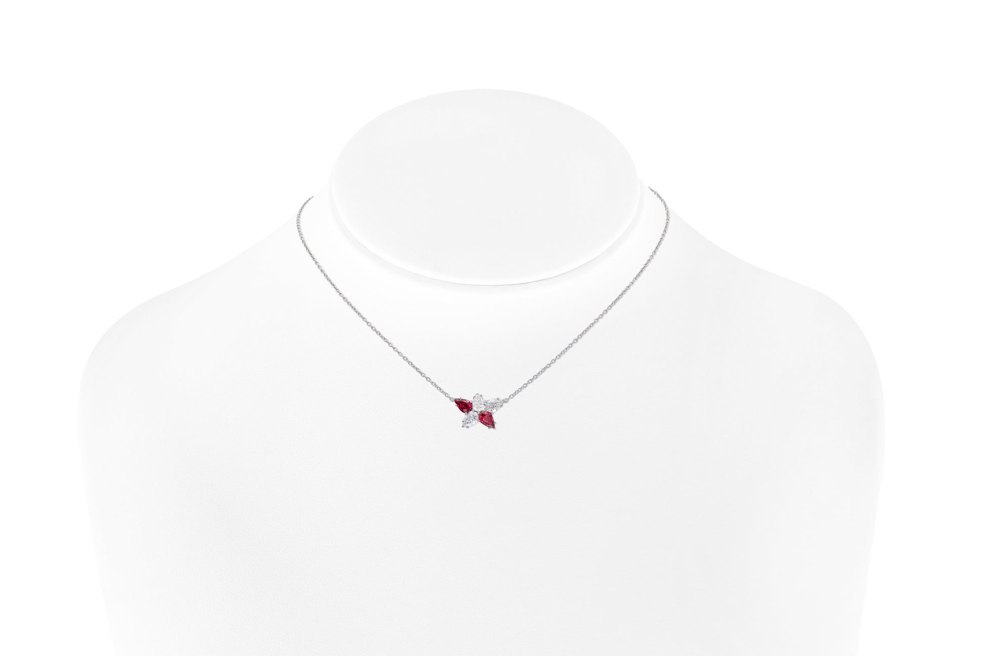 Handmade 18K White Gold Castellation Pendant with 3 GIA certified Pear Shape Diamonds D color VVS1 clarity weighting 1.20 carat & 2 Mozambique Unheated Rubies weighting 1.06 carat, Tw. 2.26 carat.