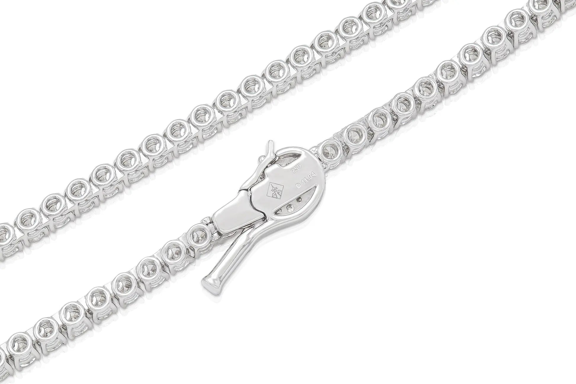 Handmade 18K White Gold Tennis Necklace with signature tennis racquet lock with 18 pave diamonds Tw. 0.11 carat & 136 Round Brilliant Diamonds D color VVS clarity weighting 11.94 carat, 16 inch.